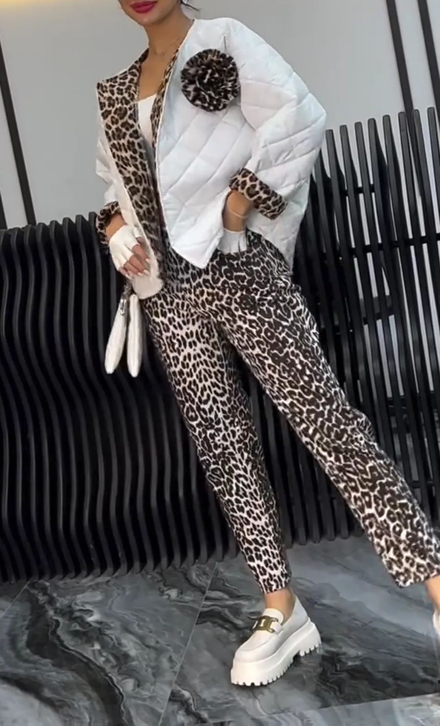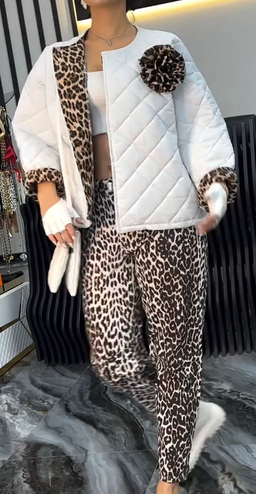 Estilo: Esta chaqueta presenta un diseño único y llamativo con una textura acolchada elegante y un acento de estampado de leopardo juguetón. La silueta corta añade un toque de moda, mientras que el cuello oversized y el detalle de flor desmontable crean un aire elegante. Esta chaqueta versátil puede fácilmente transitar del día a la noche, haciéndola perfecta para cualquier ocasión.